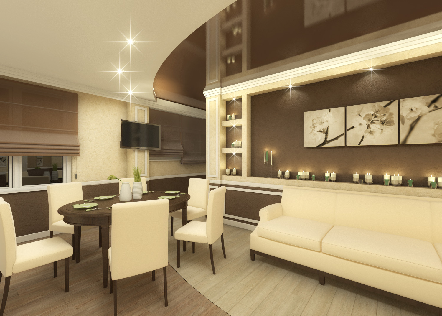Многоуровневые потолки в дизайне кухни-гостиной