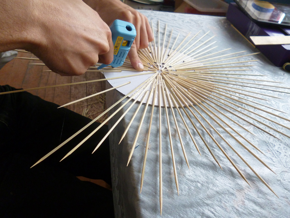 После того как вы нарежете дюбели, разложите их на полу вокруг зеркала так, как они потом будут висеть на стене. Распределяйте палочки, как вы посчитаете нужным. Здесь нет системы — просто разместите их, чередуя лучи разной длины. Как только все они будут на месте, сделайте несколько простых вычислений, чтобы выяснить расстояние между дюбелями. Это будет примерно по 3 см. Можете пометить дюбели цифрами, чтобы потом быстро прикрепить их по порядку.