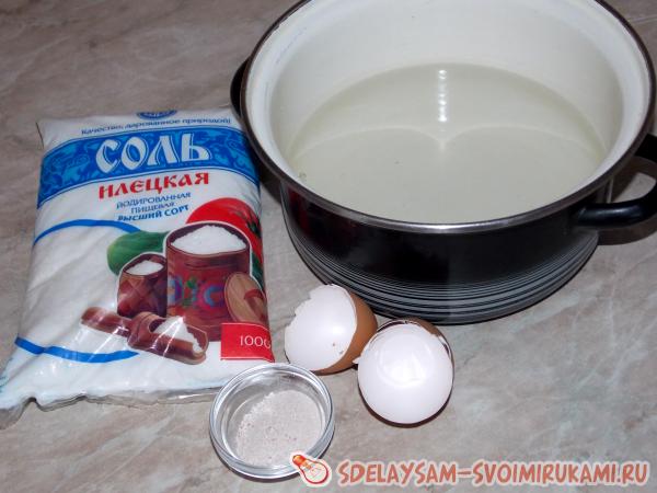 3 способ. В кастрюльку наливаем литр воды, ставим на огонь, бросаем измельченную скорлупу от двух яиц (сырых) и 30 г. соли.