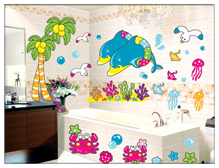 Часто стены в ванной отделаны кафельной плиткой. Если на фрагментах есть фактурные узоры или красивые картинки, то украшение для ванной можно не подбирать. Ну а когда кафель однотонный, помогают стикеры, виниловые наклейки и другие картинки, продающиеся в магазине сантехнических изделий. Наклейки имеют различную форму, расцветку и размеры. Изготавливаются изделия из влагостойкого материала и просты в нанесении.
