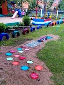 Покрышки от автомобилей изготовлены из резины. Ее можно вырезать, выворачивать, окрашивать в различные цвета, и, конечно же, обустроить резиновыми фигурками территорию дошкольного учреждения. Самое простое – вывернуть покрышку наизнанку и покрасить ее в какие-нибудь веселенькие цвета – и у вас готовая клумба с цветами. Если вкопать в землю в ряд несколько шин, то можно получить своеобразную конструкцию, по которой малыши смогут лазать.