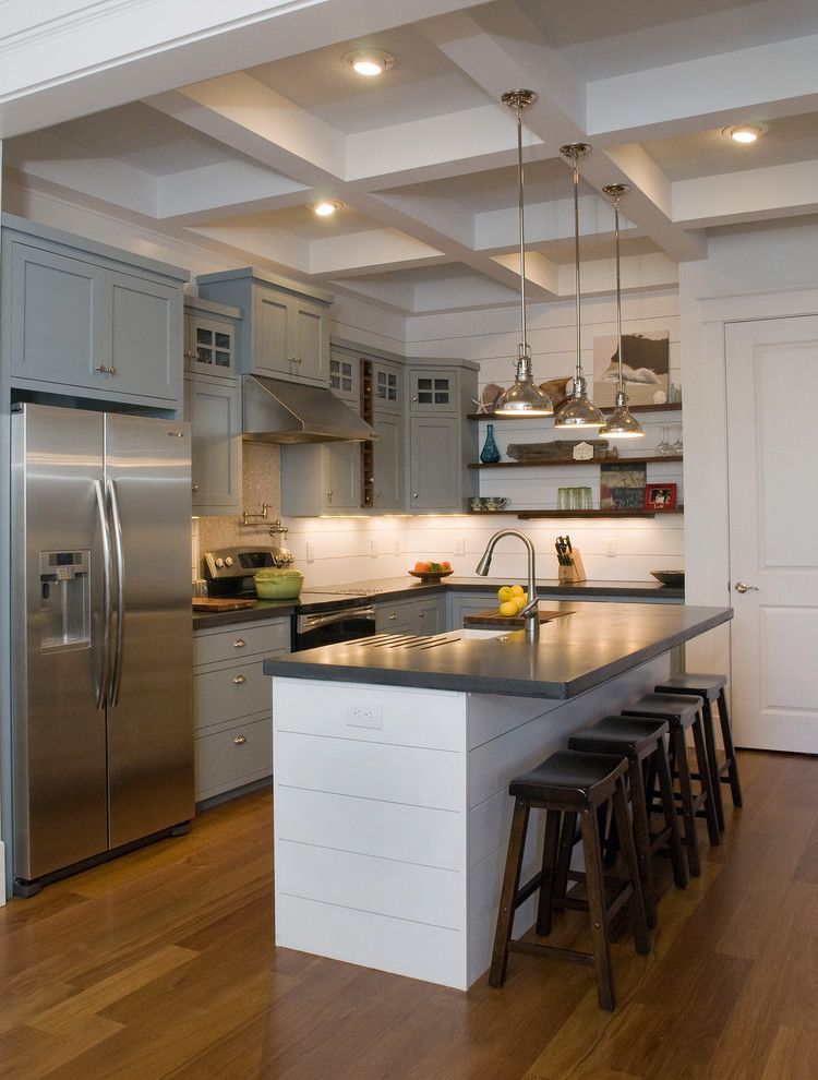 Еще одна идея, с которой интересно поэкспериментировать, если у вас есть большое пространство, — это стойки, расположенные под углом 45 градусов. Это может сделать пространство более уютным, если вы беспокоитесь, что между вашими стойками слишком большое расстояние, и обеспечивает секцию, в которой у вас большая глубина рабочей поверхности. Это делает полезное место для хранения предметов на столешнице, таких как подставка для ножей или тостер.