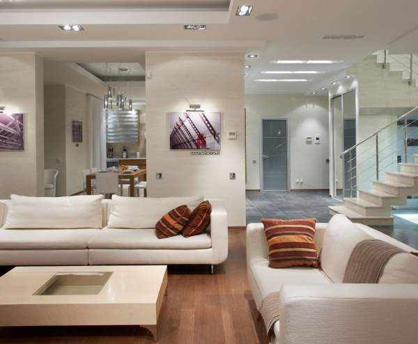 В большом частном доме проще создать желаемый дизайн, чем в квартиреОбустройство гостиной в частном доме является очень важным и ответственным процессом. При грамотном подходе можно получить комфортную, практичную и привлекательную обстановку в гостиной. Чтобы создать неповторимый дизайн комнаты можно применять самые новейшие современные материалы и проявить всю креативность. Обустройство гостиной является очень важным вопросом, поэтому необходимо подобрать цветовые сочетания, стиль, отделочные материалы. Белоснежный цвет гостиной наиболее актуален, потому как таким образом, есть возможность сделать комнату более светлой и просторной. Белый цвет наиболее приемлем для проведения оформления и мебели гостиной. Разбавить монохромную отделку стен помогут яркие стильные предметы интерьера.