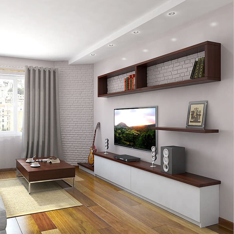 Достаточный для комфортного пребывания в гостиной набор мебельных конструкций включает в себя мягкую и модульную мебель. К мягкой относится диван, который в случае наличия свободного пространства дополняется мягкими креслами, стульями либо пуфами на усмотрение хозяина. Модульные конструкции представляют собой стеллажи, стенки. Подходят для расстановки книг, украшений интерьера, цветочных горшков, других предметов.