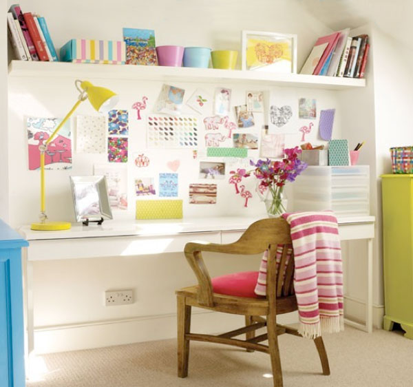 - Выбирайте максимально нейтральные цвета для обустройства рабочей зоны: бежевый, белый, молочный, разбавляя их яркими аксессуарами.