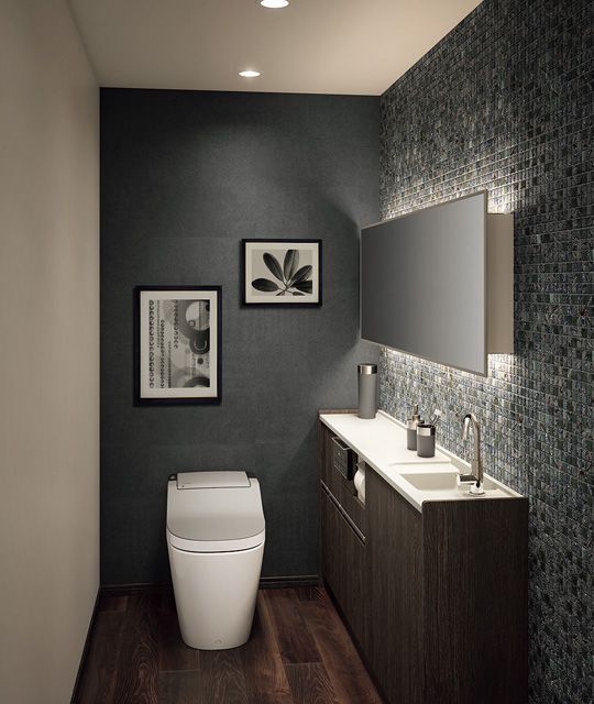 Если вы хотите сыграть на контрасте, то нужно помнить, что темные стены являются менее приемлемыми для туалета, так как на них капли воды будут заметны больше.