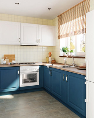Покрасьте свои шкафы в пыльно-синий оттенок, чтобы создать более расслабляющую атмосферу. Используйте шестиугольную терракотовую напольную плитку для дополнительного шарма.