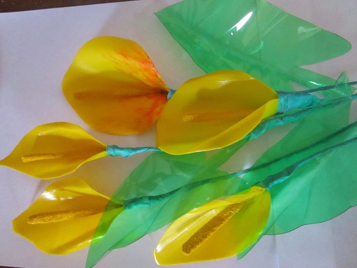 Окрашенную ёмкость разрезают на две части и обрезают их края в виде острых или закруглённых лепестков. В центре бутонов проделывают отверстие и вставляют в него подготовленный стебель с жёлтой сердцевиной. Чтобы надёжно зафиксировать стебелёк, края отверстия покрывают клеем.