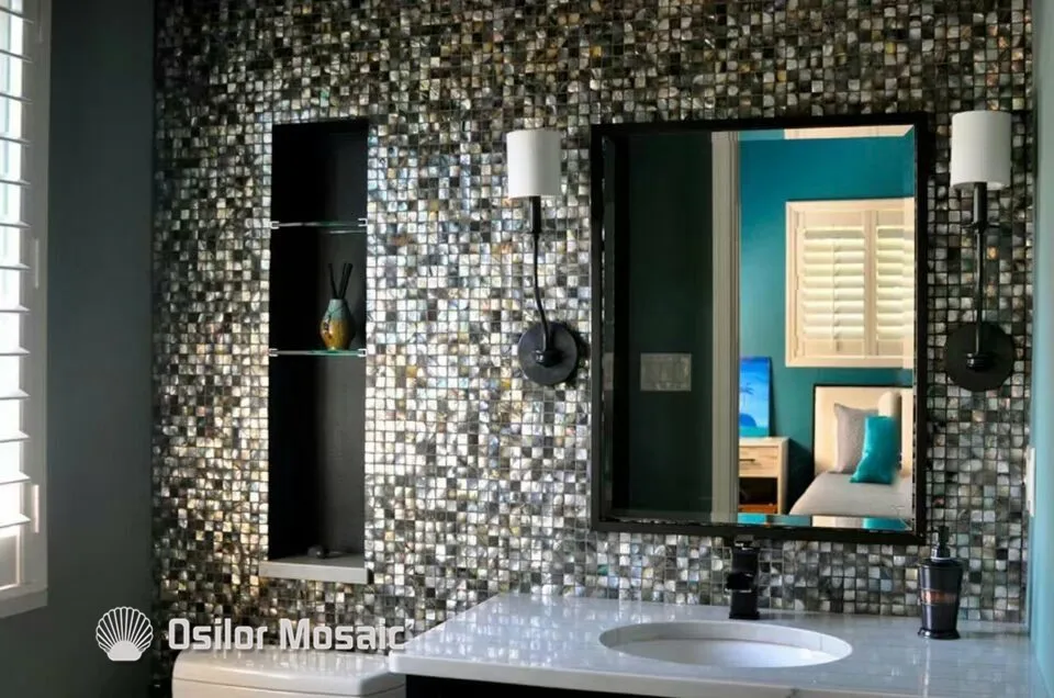 - Она находит применение в облицовке ниш, полок встроенного типа. Небольшая подсветка при этом придаст дизайну из мозаики особую эстетику.