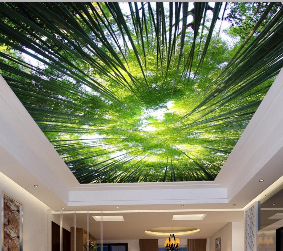 Потолок в отделкой из бамбука в интерьере гостиной, решенной в стилистике дзен