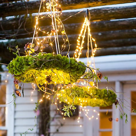 используйте высушенный мох, желуди и гирлянды для изготовления этих деревенских фонарей.
