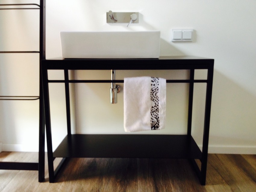 - Стол или стол-тумба сделают трубы заметными, поэтому вам придется побеспокоится об их дизайне. Традиционный белый пластик выглядит не очень эстетично и его вид только портится с годами. Зато металлические трубы могут придать вашей ванной дополнительный блеск и шарм.