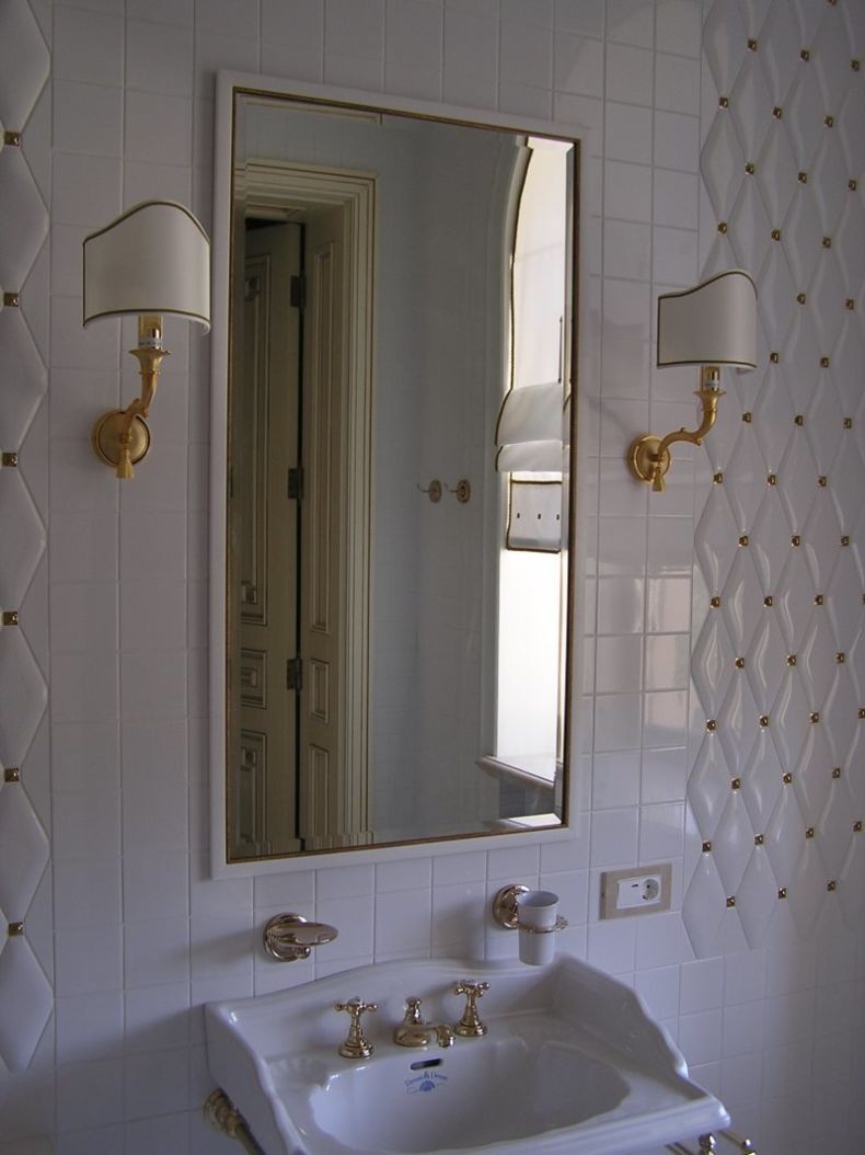 Наклеивать зеркало на плитку нельзя: поэтому обычно при монтаже плитки в ванной заранее оставляют свободный участок стены под размер будущего зеркала. Если вы не сделали этого, вам придётся убрать плитку или выбрать другой способ прикрепления зеркала к стене. Чтобы компенсировать перепад высот, если толщина оказалась разной у плитки и у зеркала (чаще всего, зеркало – тоньше), под изделие наносится дополнительный слой штукатурки, или между ним и стеной устанавливается лист водостойкого гипсокартона. Стыки можно обработать клеем или санитарным герметиком.
