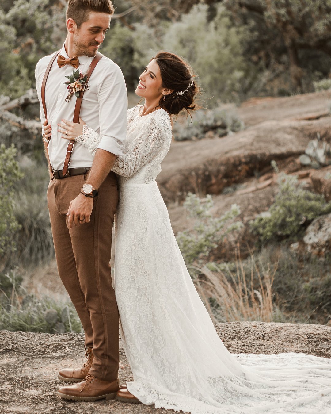 Жених в костюме любого природного оттенка, особенно бежево-коричневой гаммы. Возможно без пиджака и жилета, в рубашке и брюках на подтяжках, с галстуком-бабочкой и в шляпе. Подойдёт поклонникам бороды и длинных волос в духе хиппи.